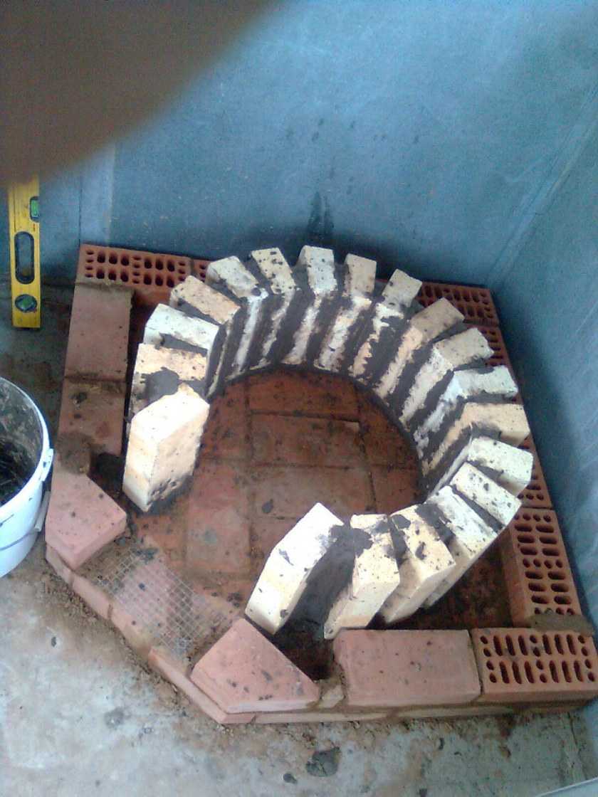 - Ряд кирпичей выкладывают по бокам от шаблона так, чтобы они плотно прилегали к фанерной арке. Кирпичи смещают для перевязки швов и под одинаковыми углами поднимают справа и слева от арки. Далее используют только клиновидные или срезанные камни, смыкая арку на середине. Для выхода дыма должно остаться небольшое отверстие.