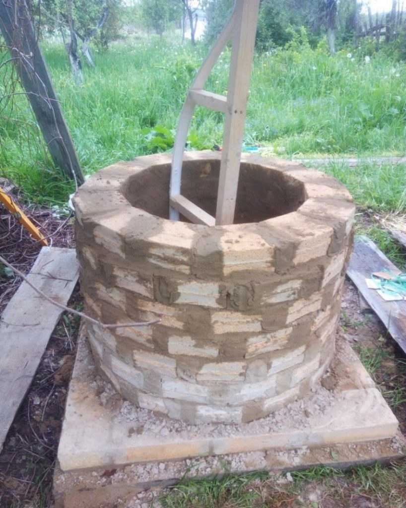 Во время кладки важно контролировать, чтобы внутренние кромки блоков плотно соприкасались между собой. После укладки 1—3 ряда конструкция перетягивается железной проволокой. Во втором ряду нужно резать кирпич на клин