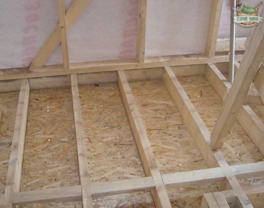 Далее эковата была закрыта еще одним слоем OSB-3. Листы нарезались на части так, чтобы их края располагались на лагах. Между лагами и нижней обвязкой каркаса стен также закреплены деревянные закладные, служащие опорами для OSB-3.
