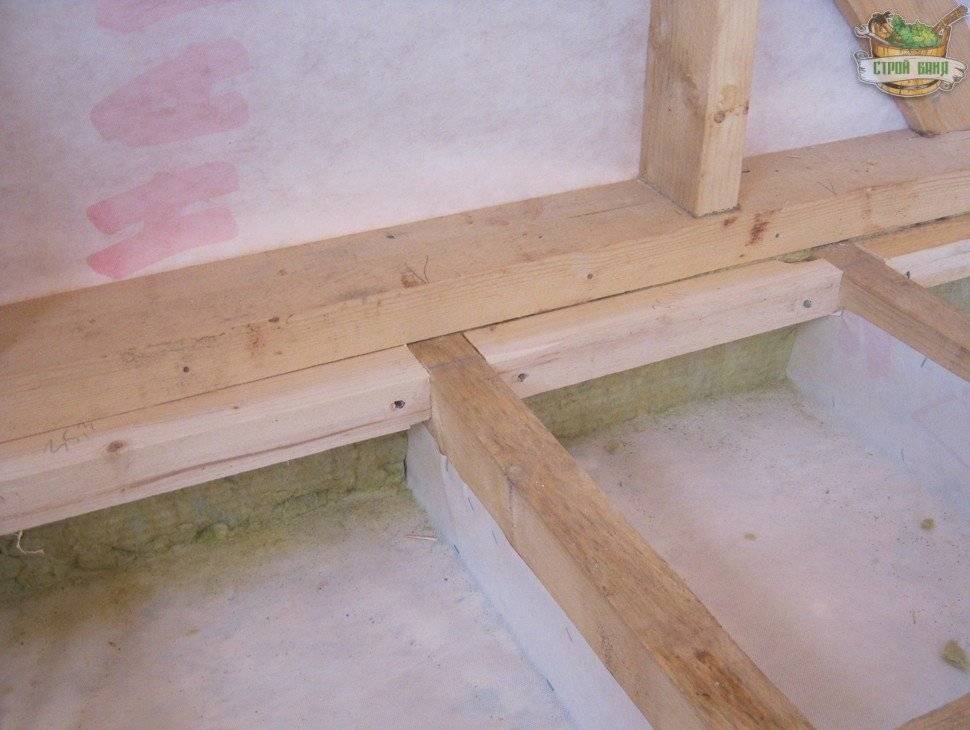 В качестве балок перекрытия и стропил для каркасной бани следует использовать брус сечением не менее 15х5 см, предварительно обработанный антисептиком. Их необходимо ставить на ребро, а после скреплять между собой длинными шурупами и металлическими пластинами