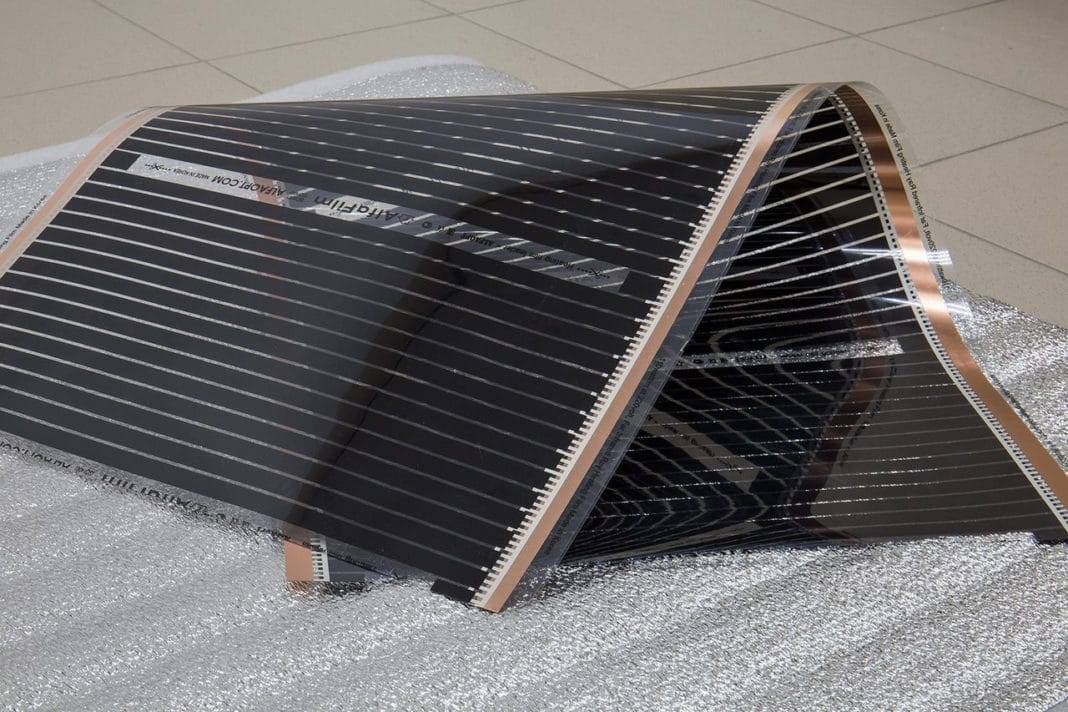 Пленочная система обогрева пола является менее мощным отопительным оборудованием, но более безопасна и хорошо сочетается с покрытием деревянного типа. Перед монтажными работами, как и в первом случае обязательно выполняется подготовка основания. При этом используется материалы, защищающие от влаги и теплоизоляционное покрытие.
