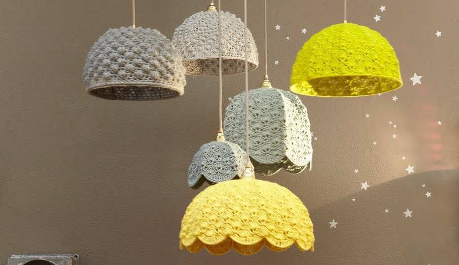 Вязаные абажуры на каркасе служат интересной заменой обыкновенным в силу того, что их можно вписать практически в любой интерьер. Для детской подобный выбор крайне интересен, в особенности если плафон создала мама малыша.