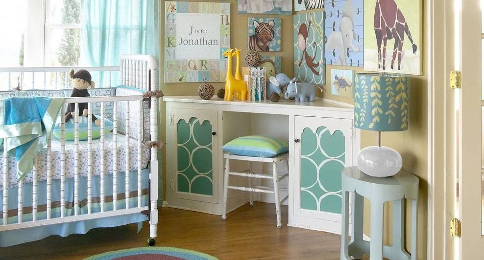 Необычный колпак для светильника в детской дополнен орнаментом, перекликающимся по цвету и со стенами, и с элементами отделки мебели. Подобная модель связывает всю композицию комнаты воедино.