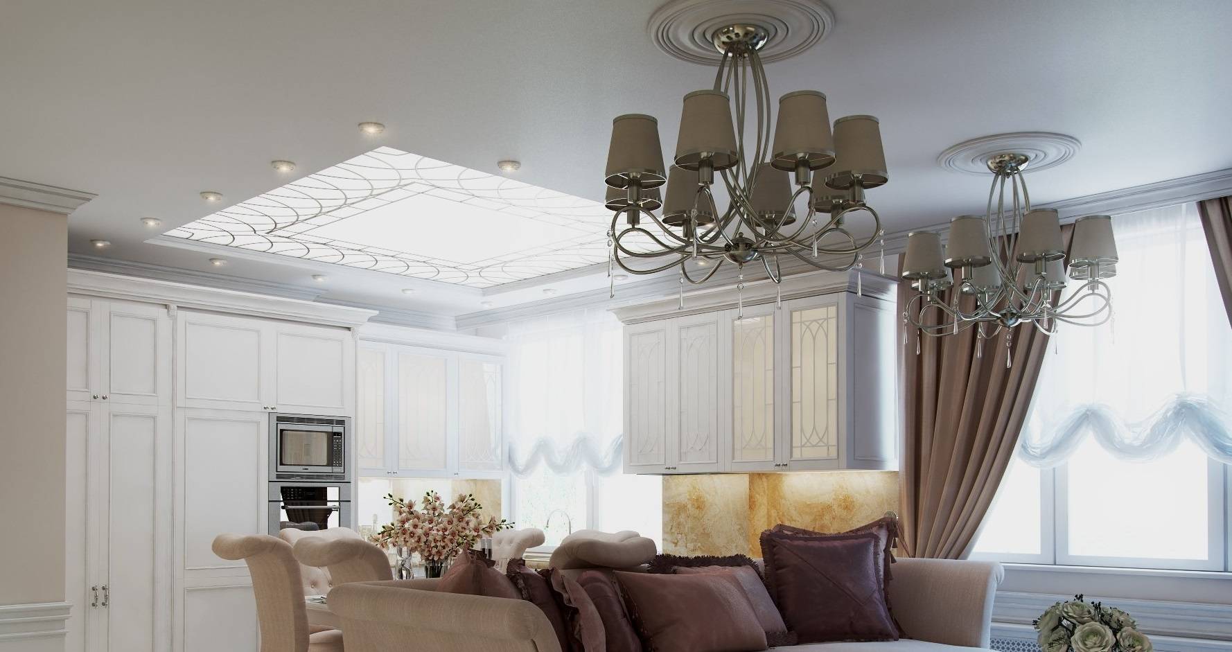Не всегда колпак должен скрывать только лампочку. В современном дизайне модно, когда полупрозрачный плафон скрывает целую хрустальную люстру. Такой прием позволяет сделать атмосферу комнаты интимнее и гламурнее, придавая ей налет загадочности и мистики.