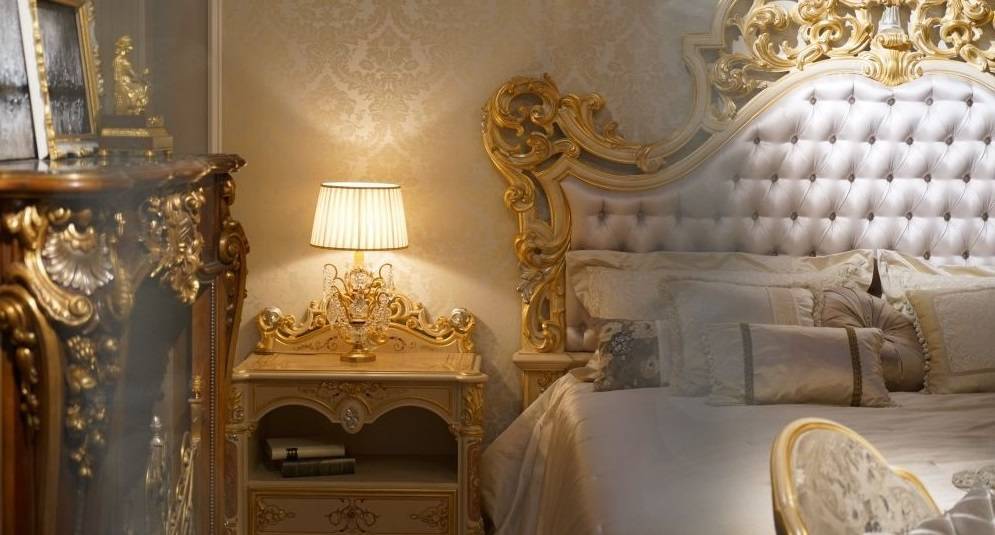Барочная мебель под старину прекрасно дополнена светильником на резном золоченом основании с простым тканевым плафоном. Мягкий белый свет дарит комнате уют, немного скрадывая вычурность и торжественность, однако для спальни подобное только на пользу.