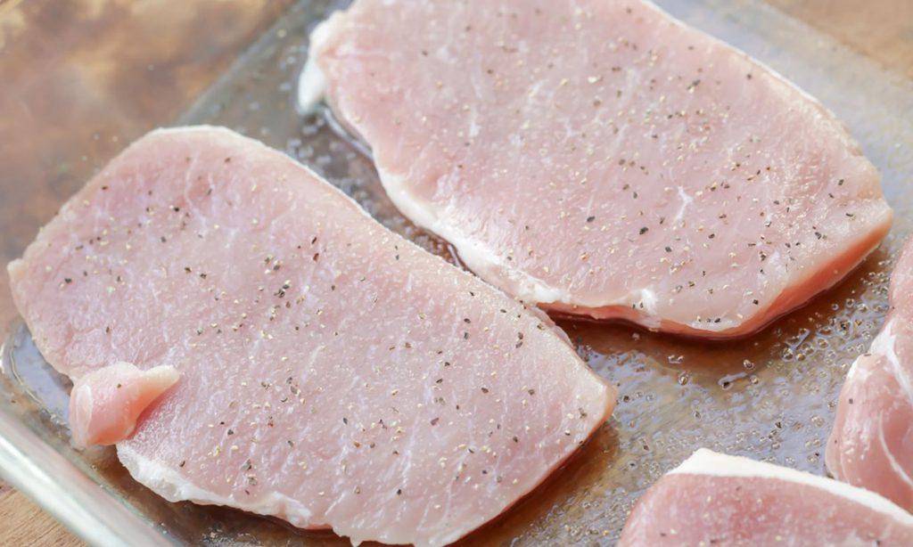 Для приготовления плотных и сочных свиных стейков выбирают мясо с задней части туши. Толщина куска – 1,5 – 2 см.
