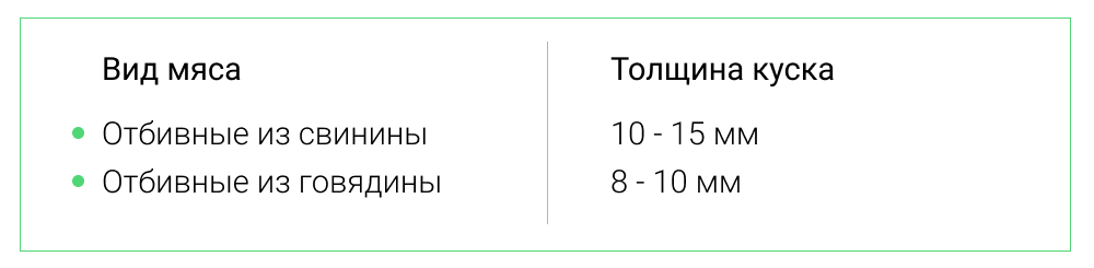 Толщина куска мяса для приготовления свиных отбивных – 10-15 мм, для приготовления отбивных из говяжьего мяса – 8-10 мм.