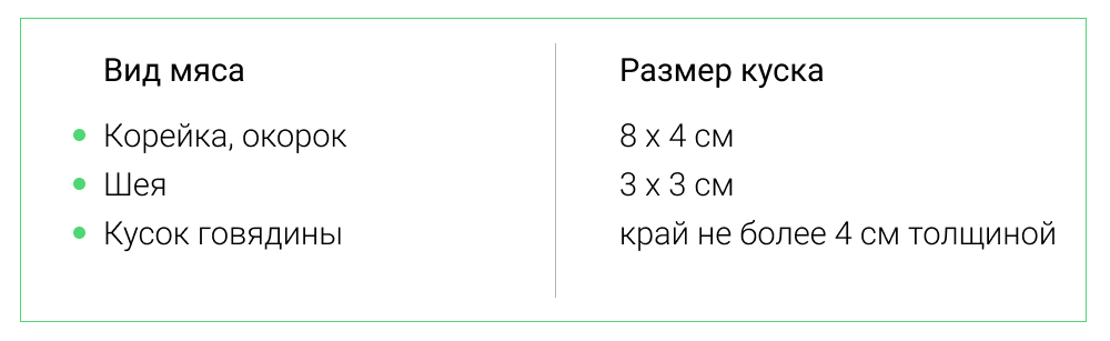 Мясо говядины следует нарезать поперек волокон небольшими кусками с толщиной края не более 4 см.