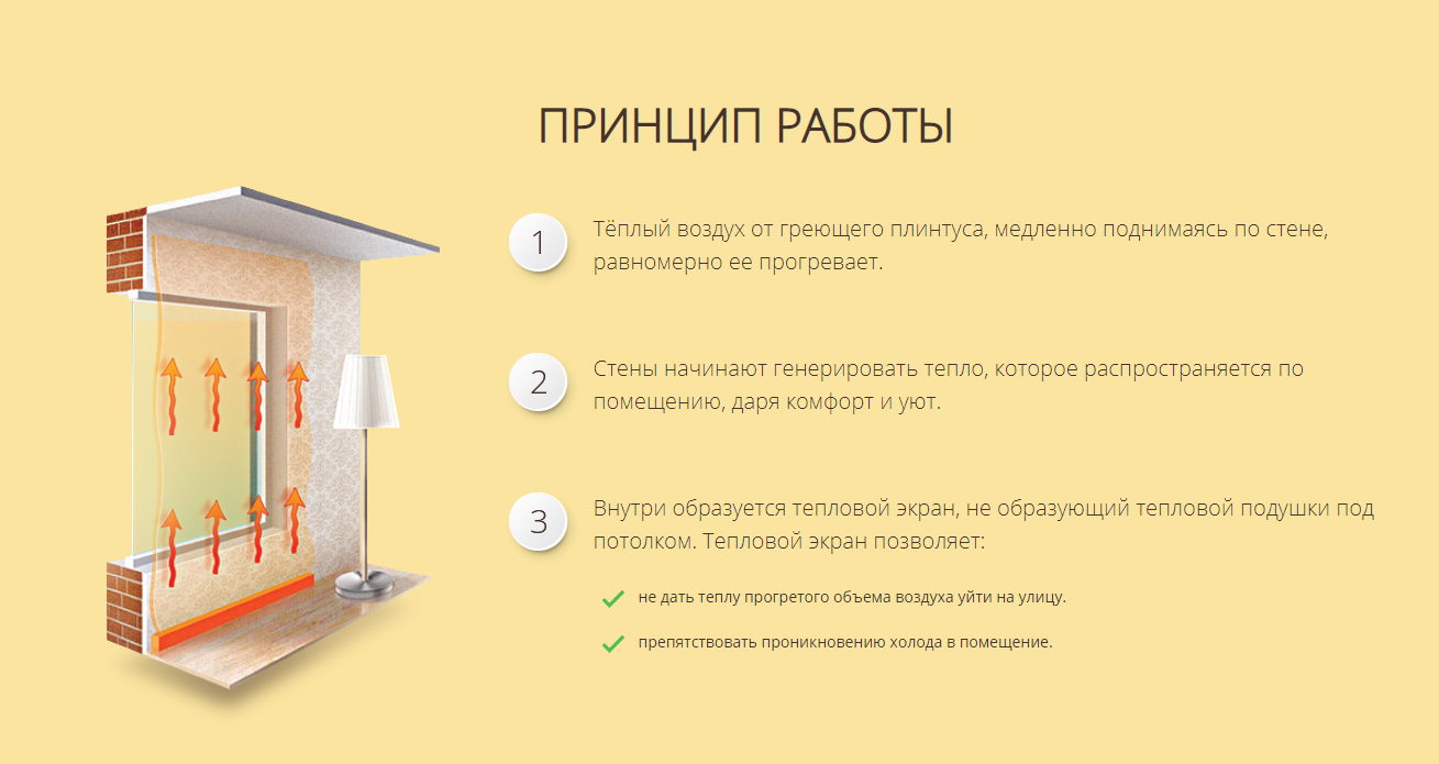 - После этого плинтус начинает работу. Он разогревается и отдает тепло стенам, образуя таким образом тепловую завесу.