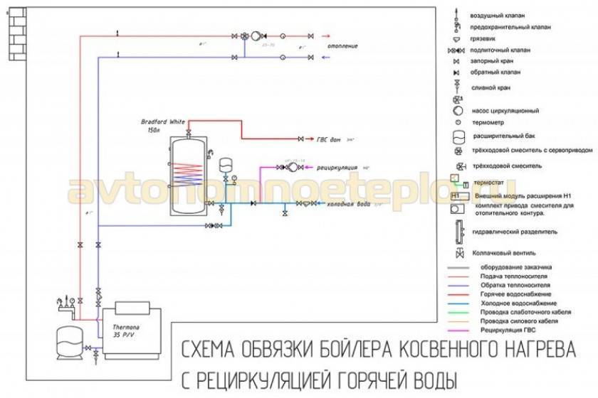 Схема обвязки бойлера косвенного нагрева с рециркуляцией практически ничем принципиально не отличается от обычного подключения. Разница в том, что перед самим смесителем или краном водоразбора устанавливается тройник, соединенный с обратным трубопроводом. Линия рециркуляции ГВС через бойлер косвенного нагрева будет работать исключительно с применением насосного оборудования.
