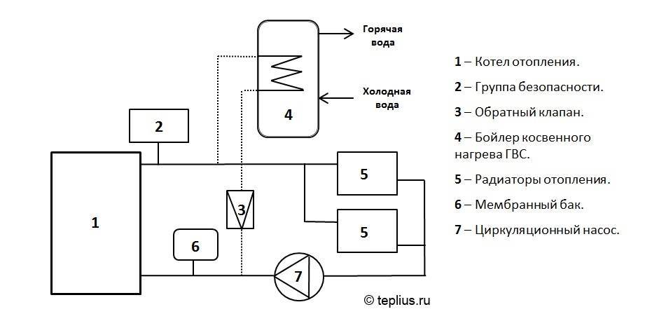 Защита котла от перегрева в системах с принудительной циркуляцией может быть также обеспечена с помощью дополнительного контура с естественной циркуляцией, к которому подключается накопительная емкость для ГВС.