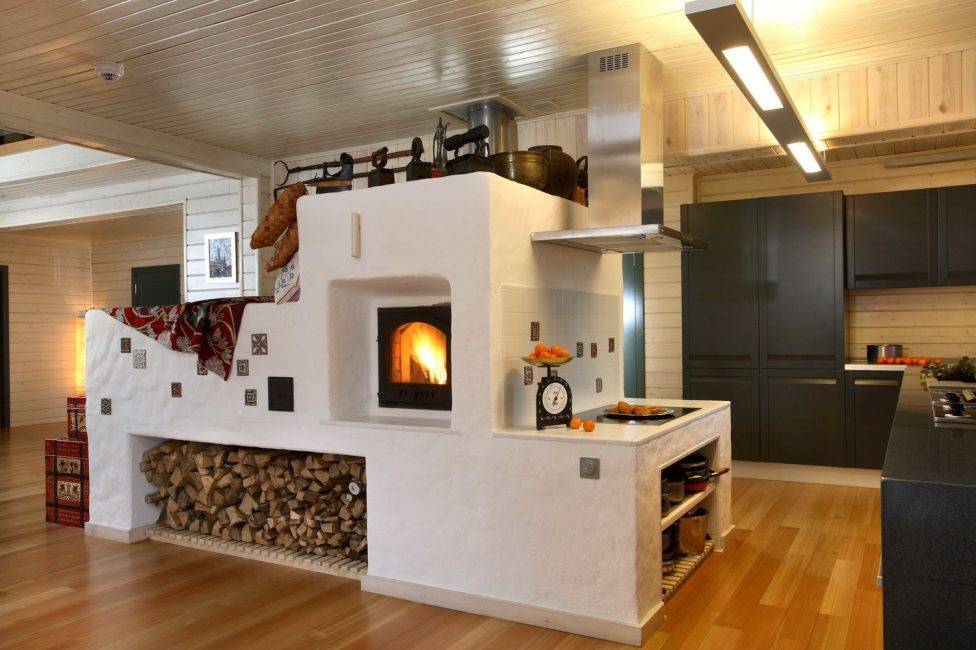 Проекты одноэтажных домов с печкой предполагают размещение печи таким образом, чтобы она полностью или частично выступала в качестве межкомнатной перегородки. В двухэтажном коттедже верхний этаж обогревают при помощи дымохода, проходящего по стене, и дополнительно установленного каменного или кирпичного камина. Неоспоримым достоинством такой системы является возможность накапливания и отдачи тепла даже после завершения топки печи.