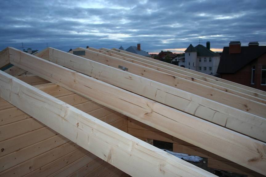 Только после полной усадки древесины можно приступать к возведению крыши. Это один из самых сложных этапов в строительстве. Сначала надо положить строительные балки. Далее, прикрепить к ним строительные ноги. Если в проекте бани предусмотрена крыша из листового материала, то необходим каркас.