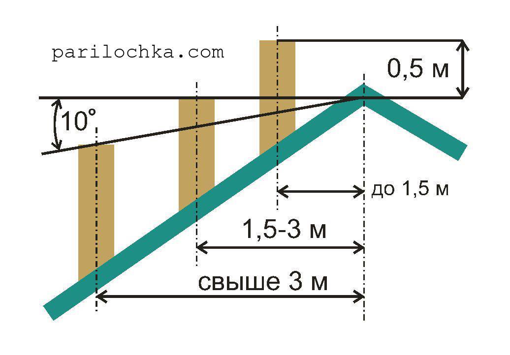 Высота трубы над коньком крыши бани зависит от того, на каком расстоянии от этого конька она находится.