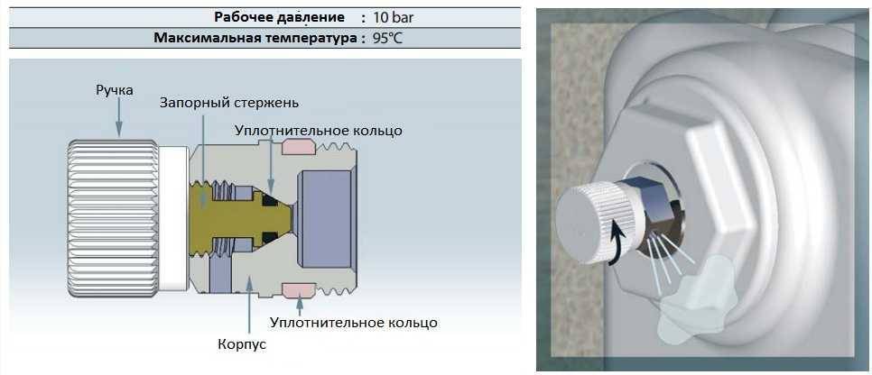 Управляется устройство запорным винтом, который регулируется снаружи, или отверткой. В закрытом положении клапан удерживает теплоноситель внутри батареи.