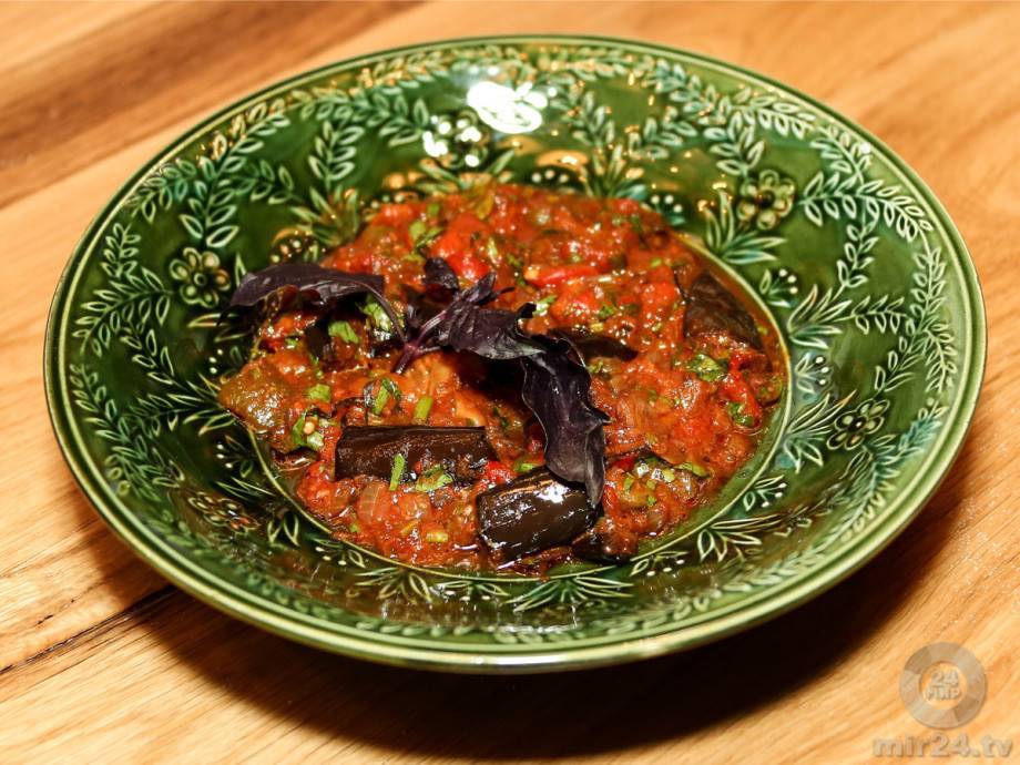 Великое множество вкусных и довольно простых блюд из баклажана предлагает грузинская кухня. Аджапсандал – блюдо из баклажанов, помидоров и болгарского перца, которые тушатся в казане с добавлением национальных специй, а в конце в них добавляют чеснок и свежую зелень. Получается нежнейшей текстуры овощное рагу, в котором, тем не менее, хорошо различимы вкусы каждого из ингредиентов. Рецепт – от шеф-повара ресторана «Казбек» Мамии Джоджуа.