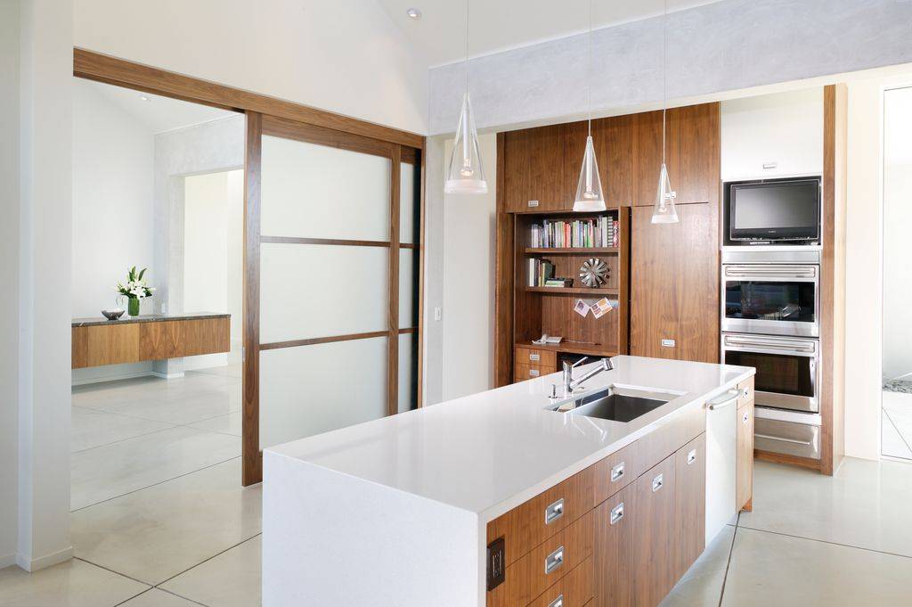 Минимум декорирующих элементов в интерьере. Кухня в этом стиле функциональная и светлая. А яркое освещение в дополнение к светлым тонам отделочных материалов добавит квартире простора.