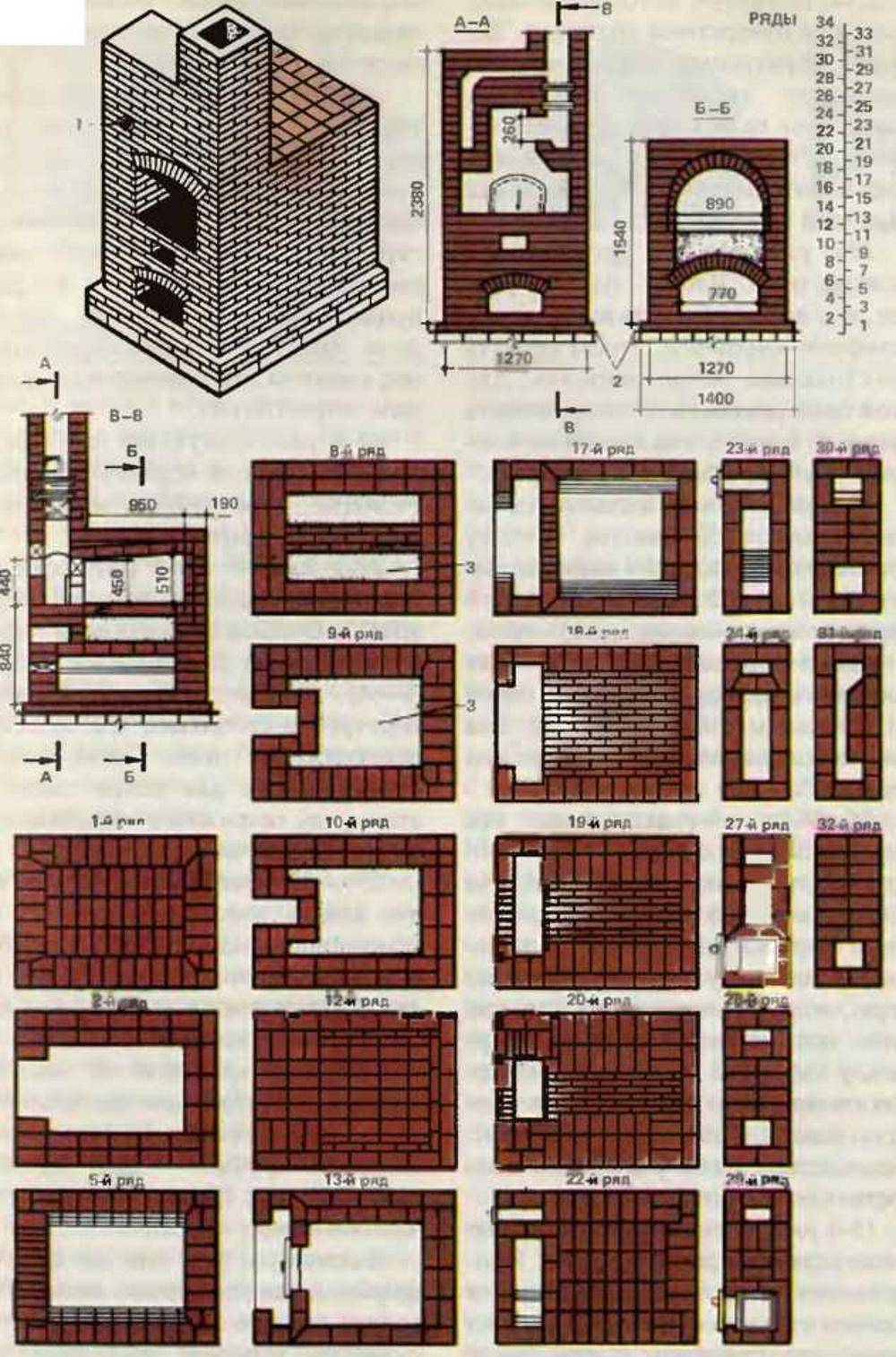 Схема кладки печи с расшифровкой по каждому ряду и поперечными разрезами