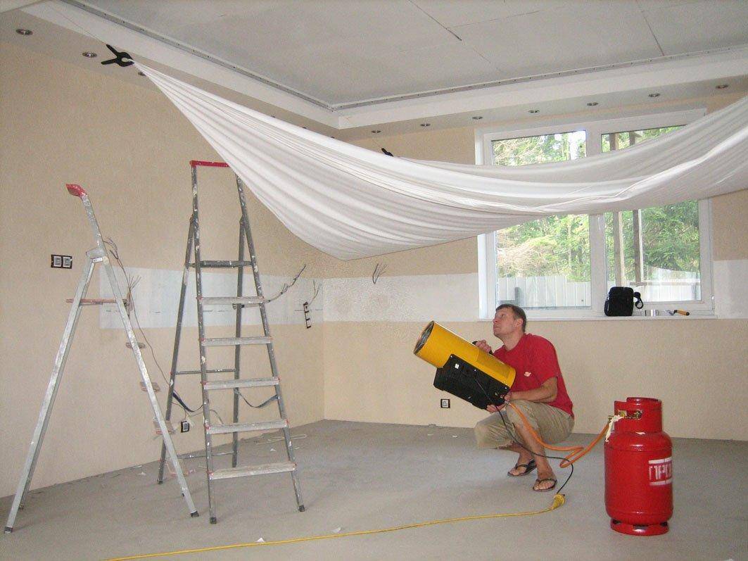 - Во-первых, Вы можете отказаться от опасной идеи пользоваться газовой пушкой и просто натянуть тканевый потолок холодным методом. В этой ситуации Вам потребуется лишь помощник, чтобы тот держал стремянку. В остальном про безопасность переживать не придется.