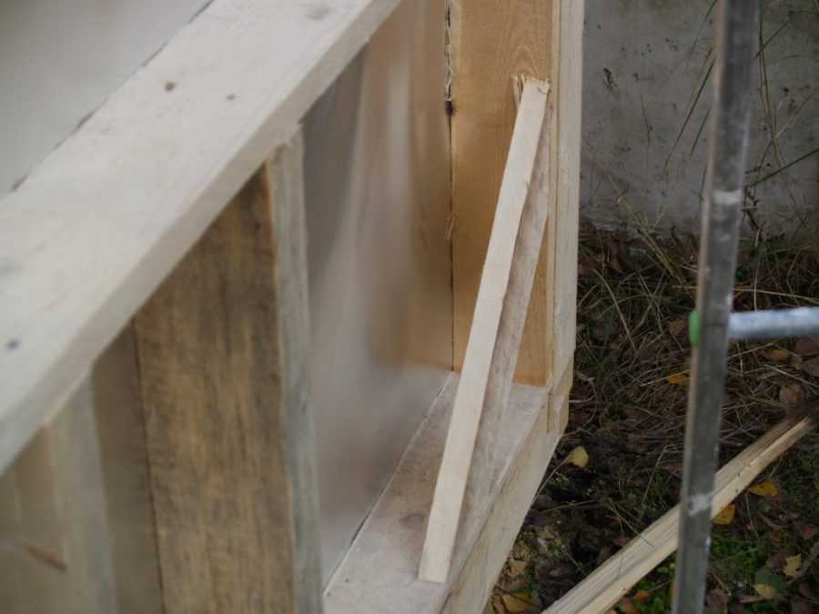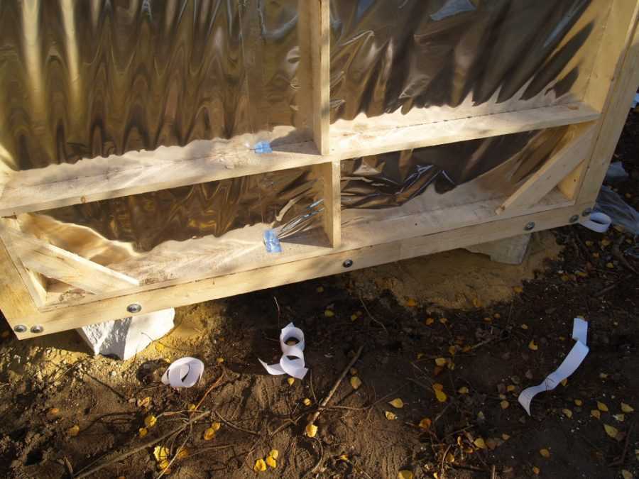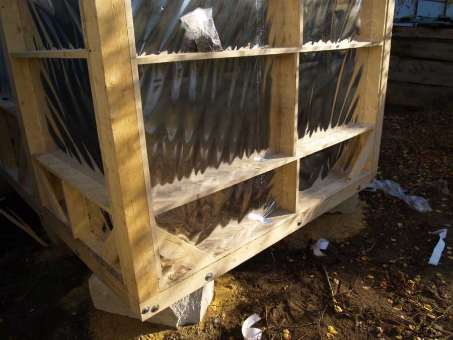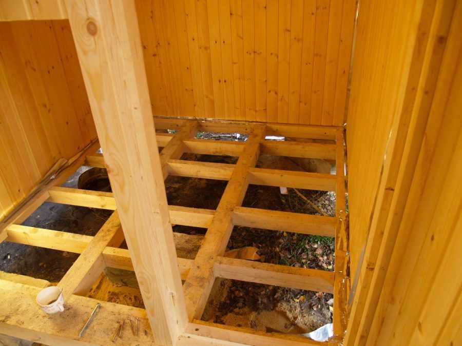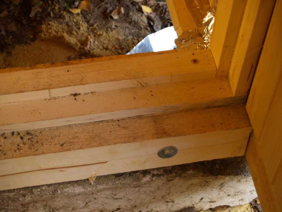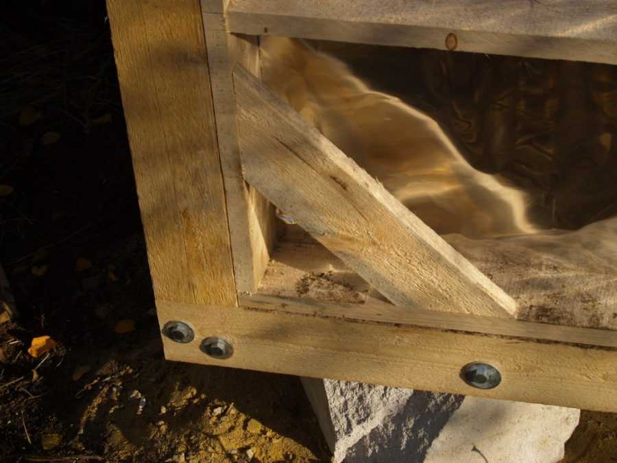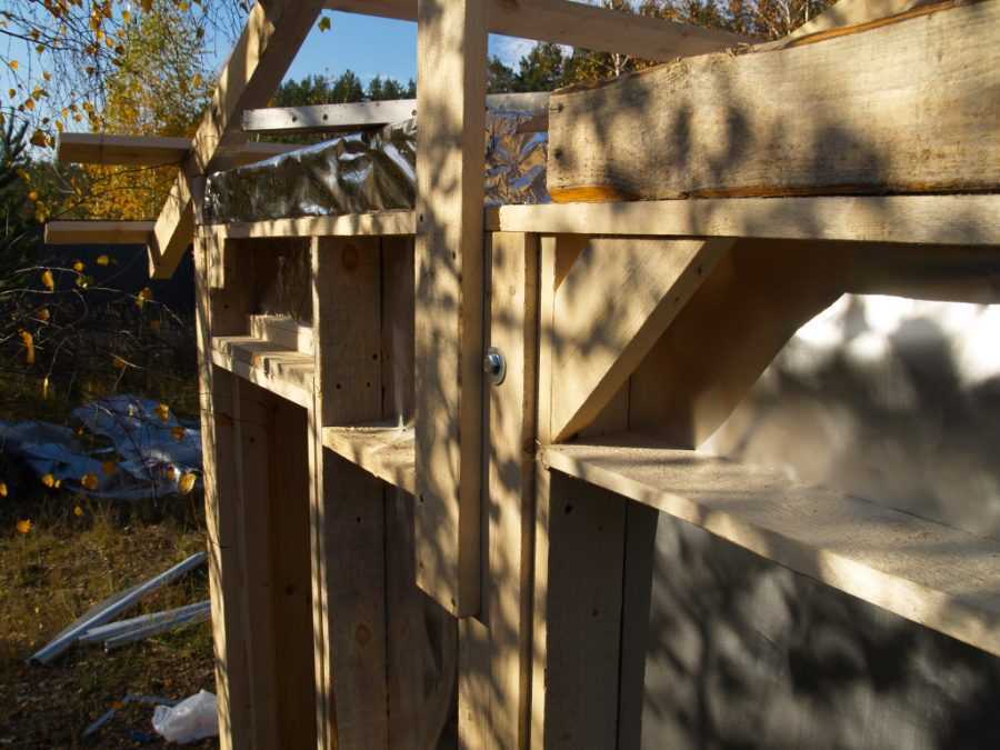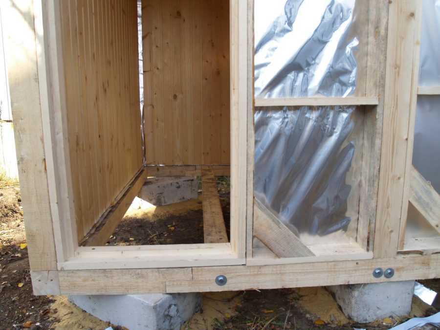 Сначала из брусьев собирается каркас, соответствующий своими габаритами и конфигурацией ранее разработанному проекту. Изнутри каркас обшивается досками. Для соединения элементов между собой используйте всевозможные анкеры и разноформатные саморезы. Поверх досок монтируются изолирующие материалы: в качестве теплоизоляции можно использовать минвату, керамзит или опилки, а в качестве гидроизоляции – битумные или полимерные мастики. Изолировать нужно не только стены, но и пол, и потолок.