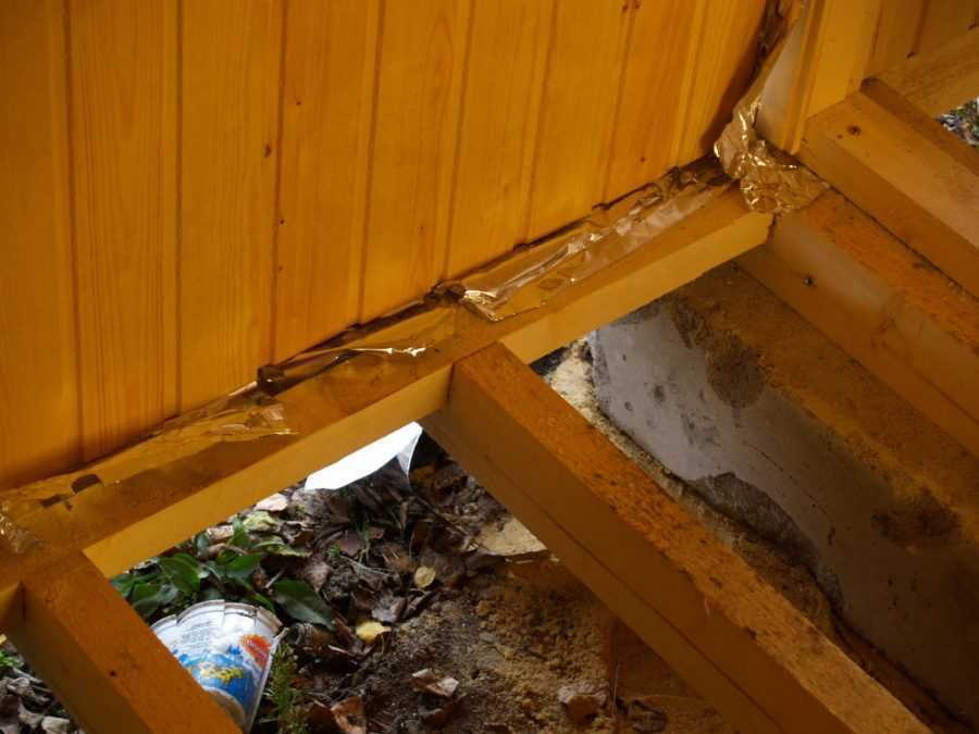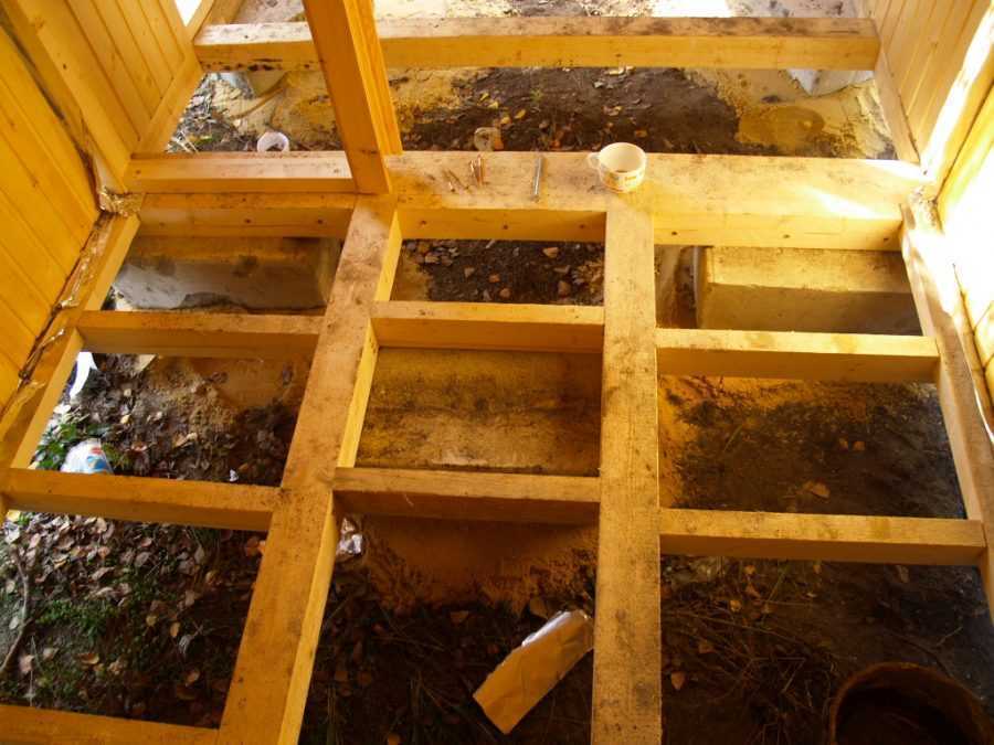 Важно выполнить консервацию дощатого пола. Между лагами – шаг 1000 мм, можно усилить конструкт и сделать шаг 600 мм.