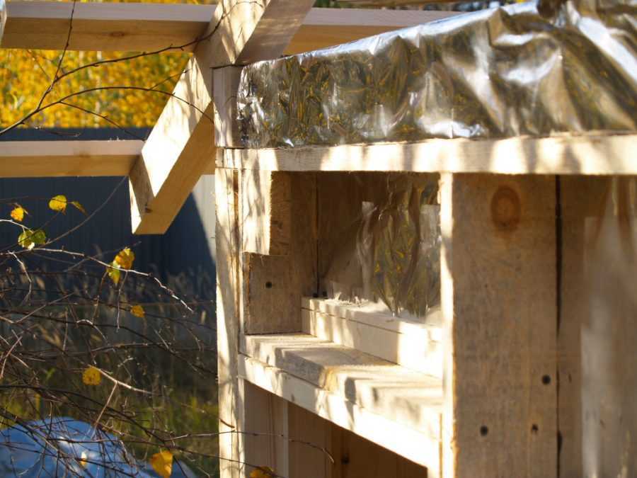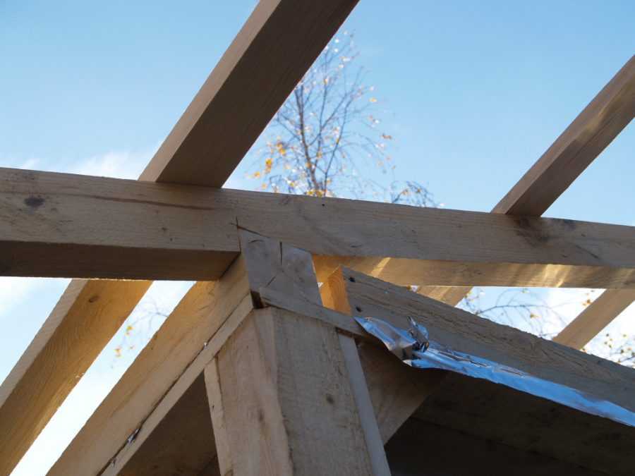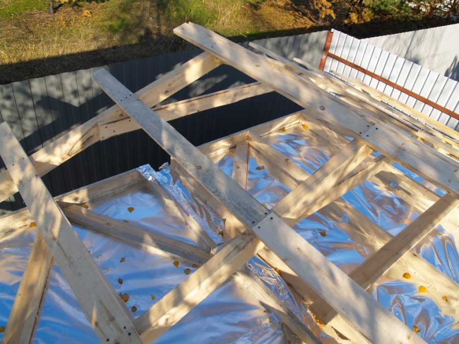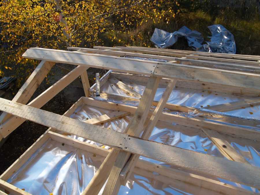 После изоляционных процедур нужно позаботиться о кровле. В качестве покрытия можно использовать профнастил, шифер или металлочерепицу: сначала монтируйте на каркас стропильную систему, а уже на ней саморезами закрепляйте кровлю. Сооружая крышу, оставьте проем для дымохода.