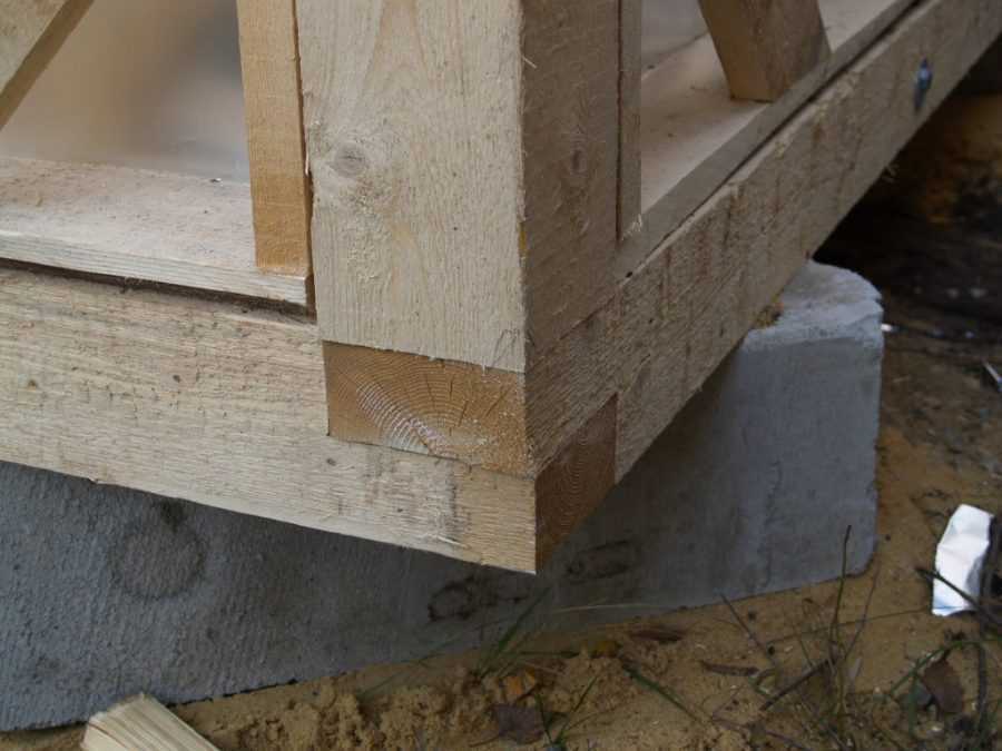 - Собирается нижняя обвязка бруса. Размеры ‒ 100*100 мм. На торцах материала высверливаются отверстия. Элементы скрепляются между собой саморезами. При использовании бруса меньших габаритов – 50*100 мм, элементы монтируются встык на металлические уголки.