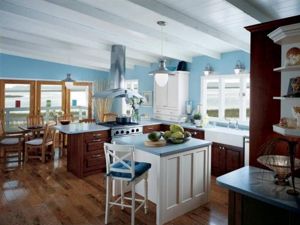 Отдайте предпочтение пастельным оттенкам. А вот обеденную зону можно выделить — синий, терракотовый, бирюзовый. Материал для нее используйте тот же, что и для остальной кухни или поищите комбинированный вариант — порой такие решения смотрятся очень выигрышно.