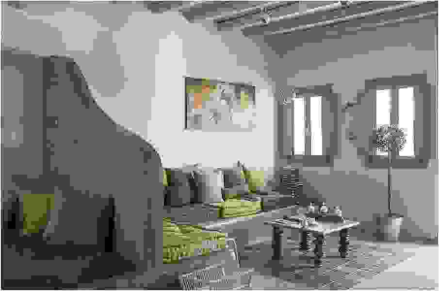 Фактурная стена — отличный способ визуально зонировать греческий интерьер