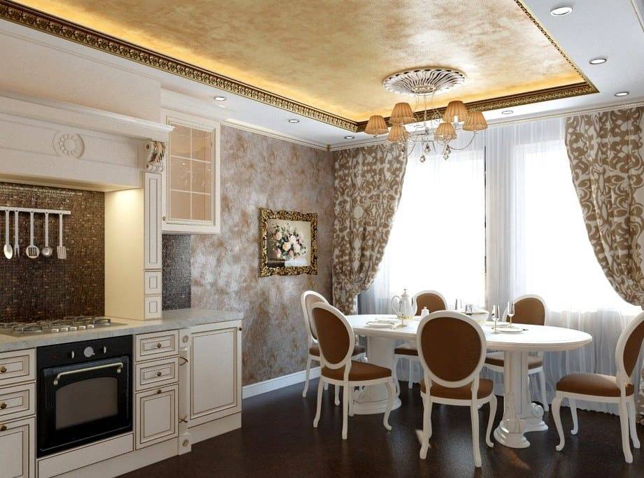 Вы можете сделать подвесной, натяжной или гипсокартонный потолок, добавить к нему деревянные , аккуратную лепнину и потолочный плинтус. Основное правило – покрытие всегда должно быть матовым.