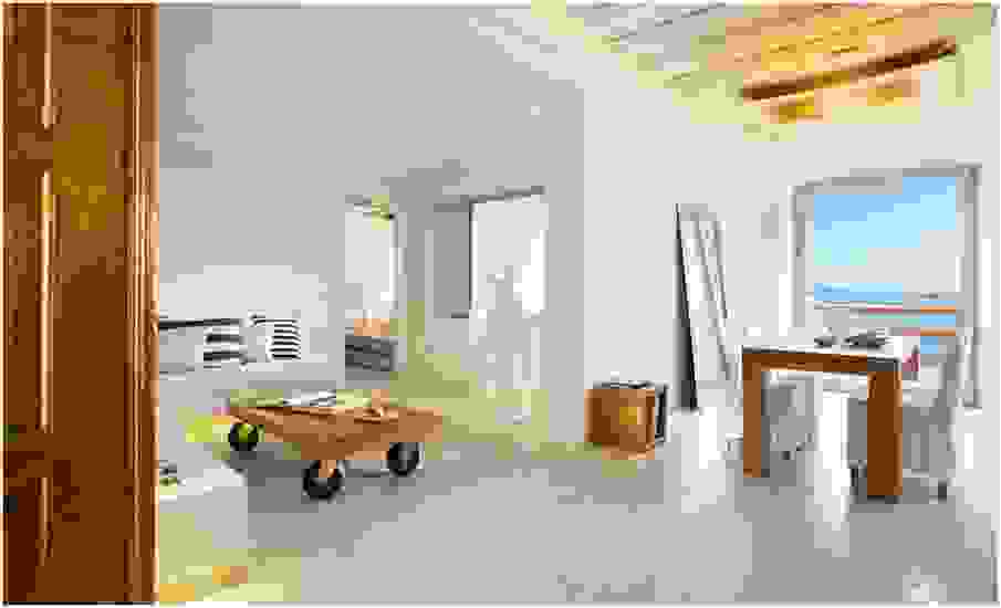 Здесь никаких излишеств, материал для пола должен соответствовать отделке стен. Если перегородка или балка выполнена в дереве, то в качестве напольного покрытия используют паркет. А если стены покрыты грубой штукатуркой, то рекомендуется использовать светлую плиткой с фактурной поверхностью. Зачастую с мозаичным узором, поскольку он тоже является узнаваемым образом греческого стиля. Пол ничем не должен кардинально отличаться от облицовки тех же стен. Однако, предпочтение отдается натуральным материалам — грубым корабельным доскам, морской гальке. Керамическая плитка на кухне или деревянный паркет вполне справляются с этими задачами.