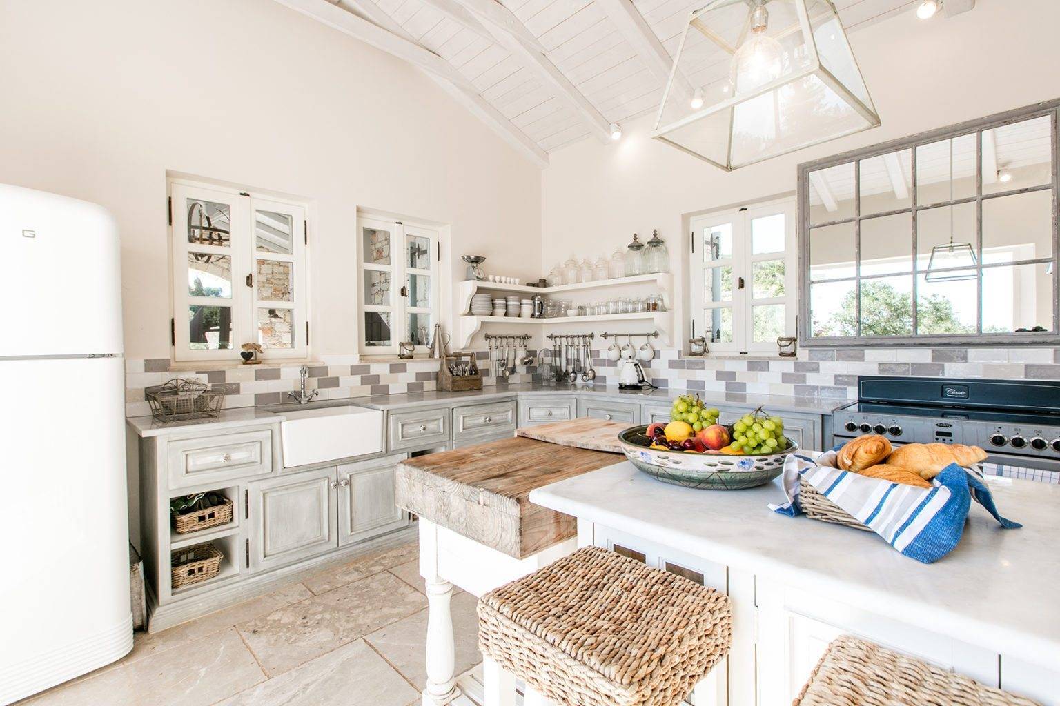 В кухню организуйте светлые шкафчики, стол грубоватый и небольших размеров. Плетеные корзинки прекрасно подойдут, чтобы хранить разные мелочи.