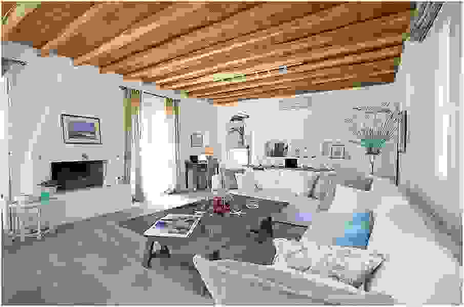 Альтернативный вариант — простой однотонный потолок, украшенный деревянными балками. Последнее не стоит делать фигурными — чем проще, тем лучше. Впрочем, эта фраза и в целом передает дух греческого стиля.