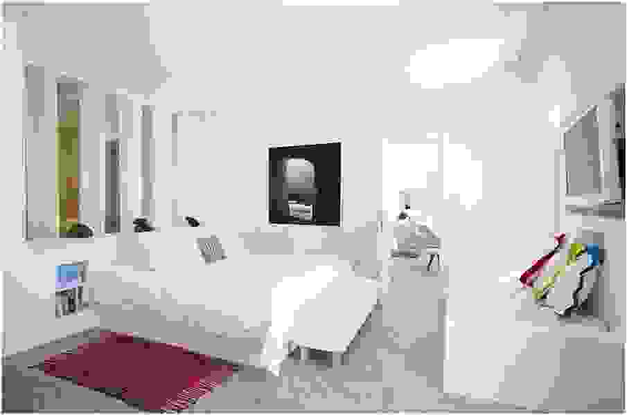 В помещении с белыми стенами, желто-бирюзовые детали расставят акценты и внесут разнообразие в интерьер