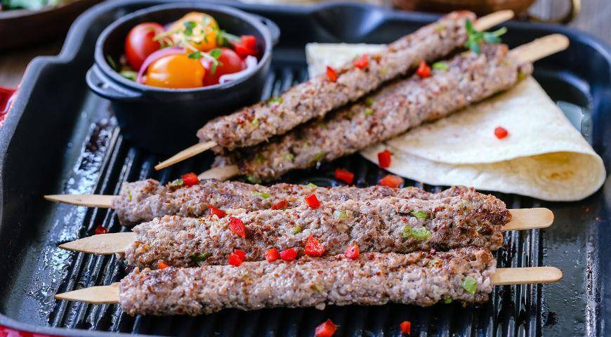 Если вы жарите кебабы на мангале— хорошенько раскалите шампура, чтобы мясо сразу «схватилось» и кебаб не упал в угли. Потом положите шампур с кебабом на решетку, обжарьте минуту и переверните. Еще жарьте минуту. Тогда фарш окончательно схватится и точно останется на шампуре. А потом готовьте кебаб минут 5–7, особо не вертя. Но кебабы можно готовить и в духовке или на сковороде — никакого преступления в этом нет, в Турции тоже так делают. Духовку нужно предварительно разогреть до 200 градусов и отправить туда кебаба на 5-7 минут. Можно использовать режим конвекции — так кебабы лучше подрумянятся.