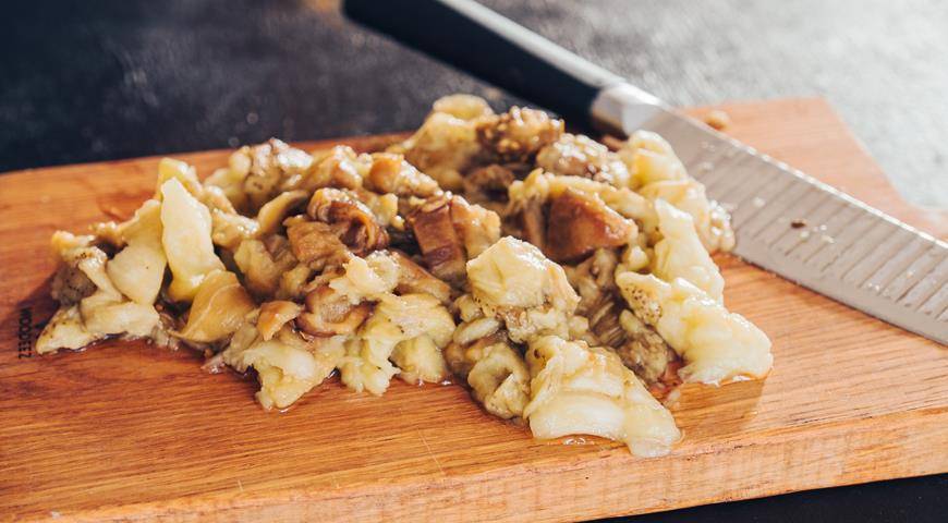 3. Готовые баклажаны очистить. Мякоть порубить ножом, но не слишком мелко, должны чувствоваться небольшие кусочки. Баклажанную мякоть можно сбрызнуть лимонным соком, чтобы не потемнела.