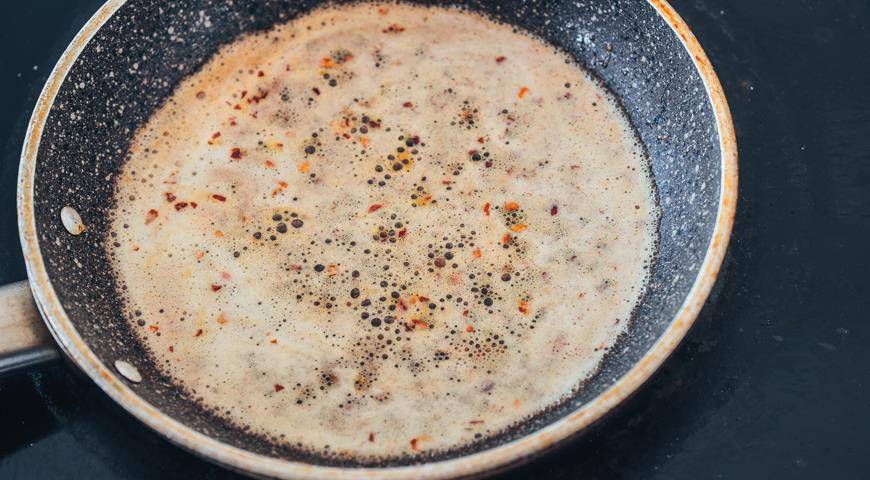 6. В сковороде растопить сливочное масло, всыпать красный перец, и, помешивая, довести до кипения. Как только появятся пузырики, снять с огня.