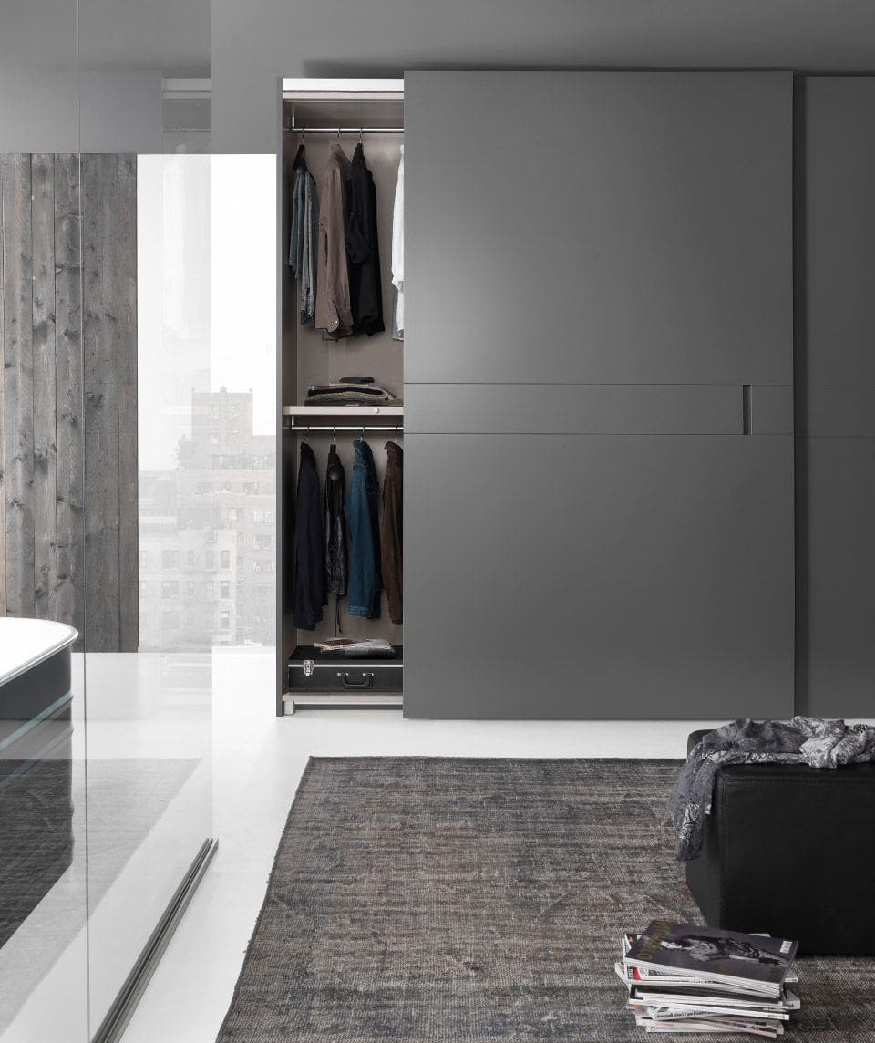 Шкаф-купе с большими створками глухой серой покраски отлично впишется в скандинавский стиль интерьера