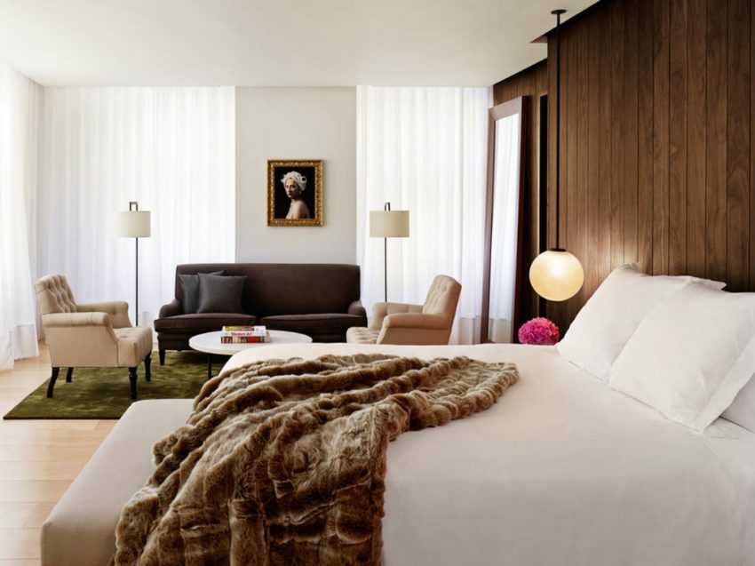 Лаконичный, скромный дизайн примечателен панорамными окнами, которые пропускают в комнату достаточное количество дневного света.