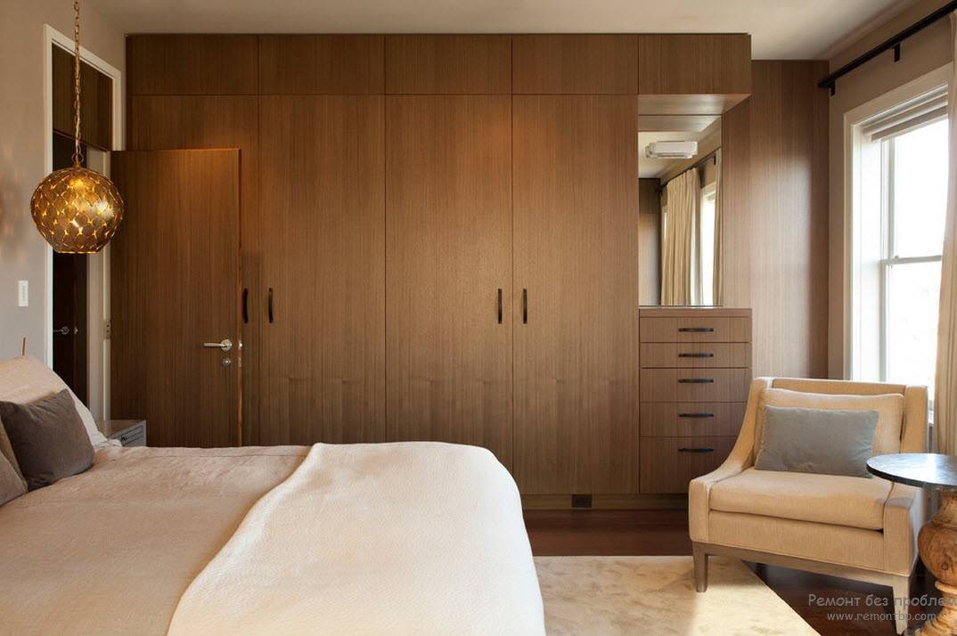 Чтобы скрыть встроенные шкафы в интерьере, выбирайте с зеркальными дверцами или древесный декор под обстановку.