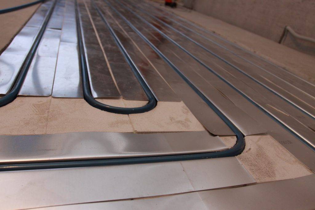 - После гидравлической проверки тёплый пол заливают стяжкой. В некоторых случаях лучше всего сделать монтаж контуров водяного трубопровода в медные теплораспределительные плиты. В данном варианте сверху насыпают керамзит, что значительно удешевляет монтаж.