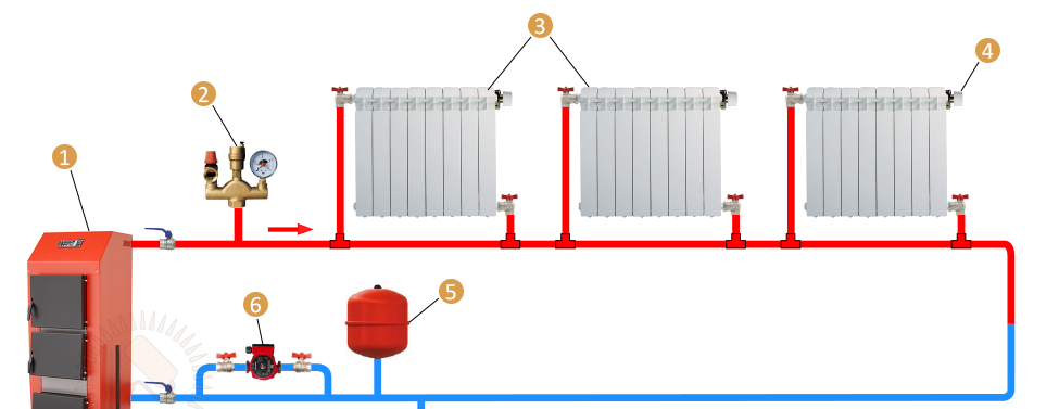 Однотрубная система отопления с принудительной циркуляцией: 1 — котёл отопления; 2 — группа безопасности; 3 — радиаторы отопления; 4 — кран Маевского; 5 — расширительный бак; 6 — циркуляционный насос; 7 — слив