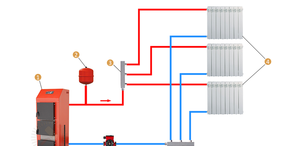 Лучевая схема отопления: 1 — котёл; 2 — расширительный бак; 3 — коллектор подачи; 4 — радиаторы отопления; 5 — коллектор обратки; 6 — циркуляционный насос