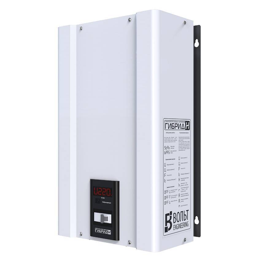 Гибридные. Считаются подтипом электромеханических. В конструкции предусмотрено два релейных стабилизатора, за счёт чего прибор может выдержать большее напряжение при скачках электроэнергии. В штатном режиме принцип действия гибридного стабилизатора ничем не отличается от работы электромеханического устройства;