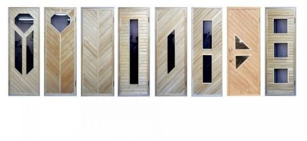 Если при планировке бани не предполагается установка двери, выполненной полностью из стекла, то оптимальны варианты конструкций из древесины, в которых присутствуют стеклянные вставки. Такой вариант позволяет сочетать экологичность дерева и практичность стекла, вставка из которого может быть любой формы и размера.