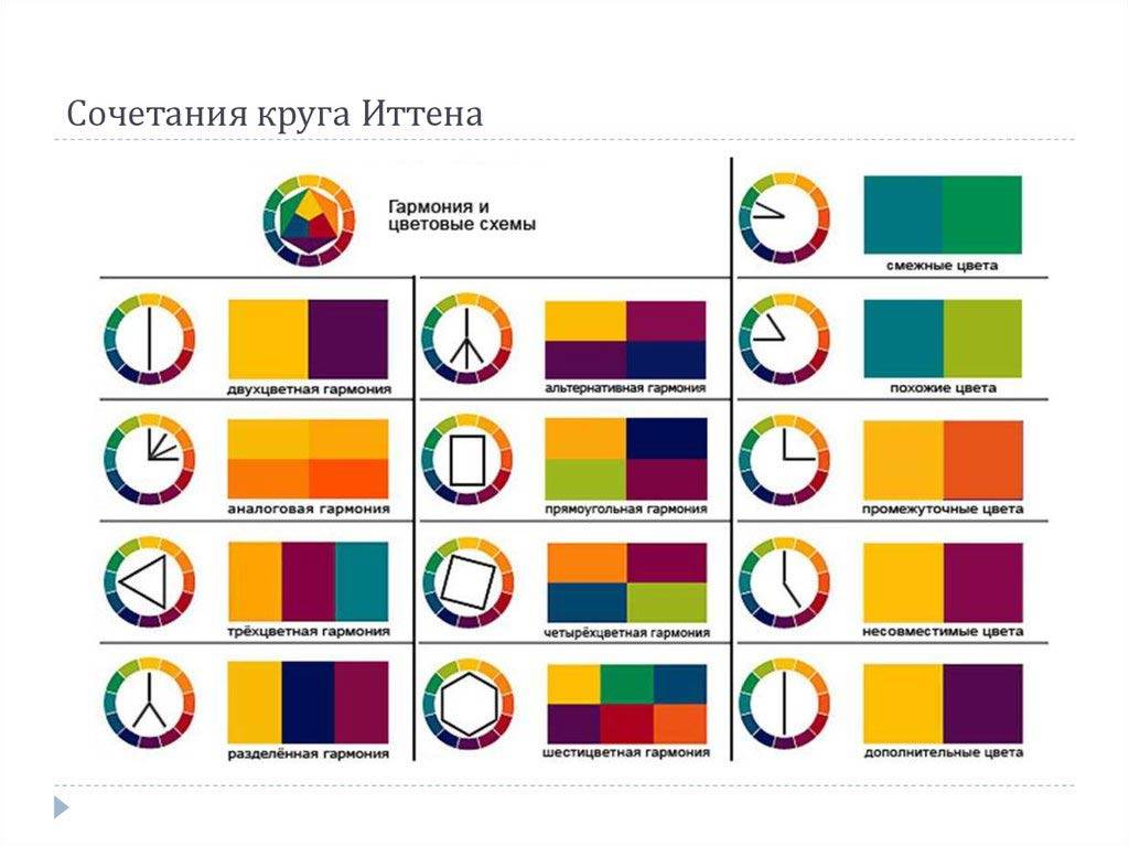 Как же пользоваться цветовым кругом? Это довольно просто, нужно только знать схемы и не бояться «играть» с колесом. Схем по сочетанию цветов в круге существует множество (см. рисунок ниже). Но есть три базовых алгоритма.