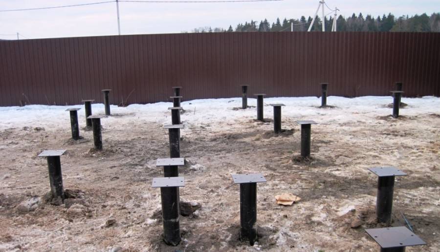 Расстояние между опорами обычно принимается за 1 – 1,5 м, но при строительстве небольших по массе строений вполне возможно увеличить этот шаг вплоть до устройства опор только по углам строения. В местах бурения при помощи штыковой лопаты намечаются лидер-лунки, в которые будет заглубляться бур.