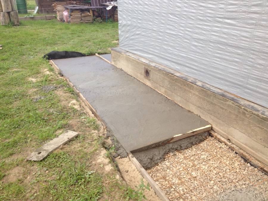 Для защиты дома от проникновения влаги необходима установка отмостки. Отмостка, как правило, заливается из бетона по всему периметру дома.