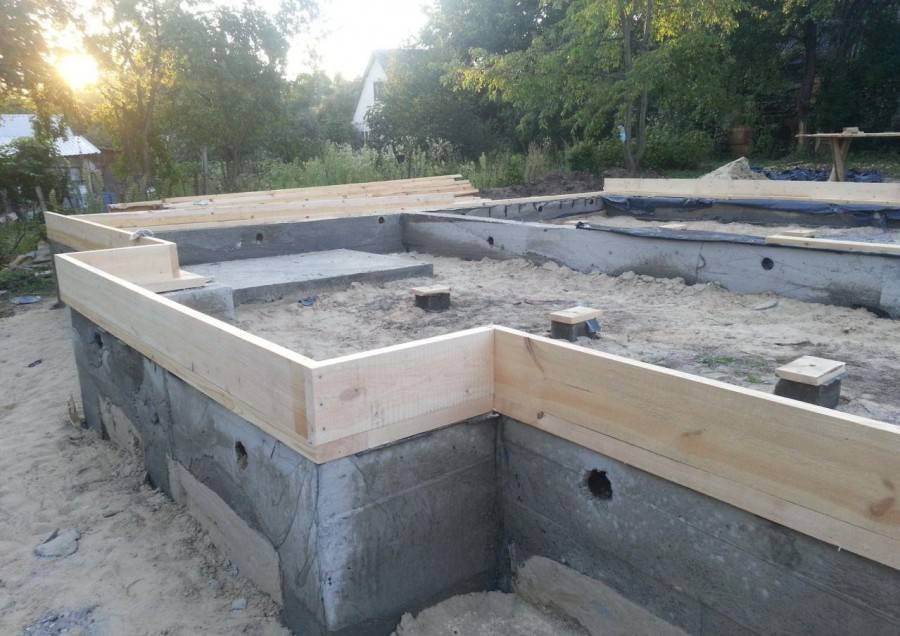 На глубину около 25 см по всему периметру дома необходимо выкопать траншею, затем поднять опалубку, сделать песчаную подушку.