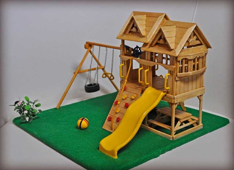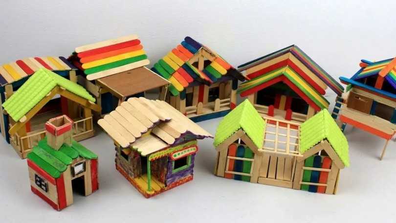 Симпатичные игрушечные дома – от самых простых домиков до сложных многоэтажных конструкций с лестницами и террасами – самая популярная поделка из палочек от мороженого.